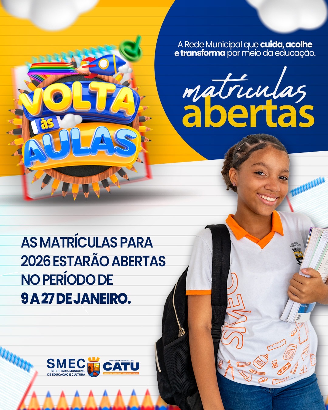 As inscrições estão abertas entre os dias 11 e 15 de abril, podendo ser feitas de forma presencial na SMEC ou online pelo link: