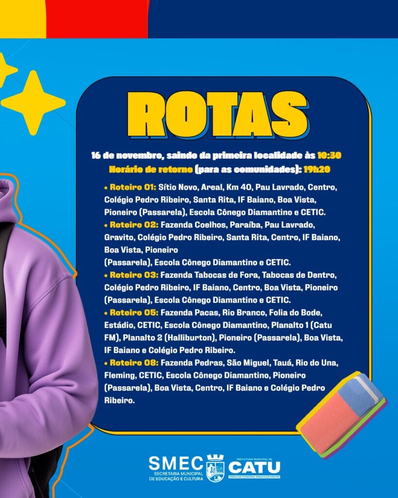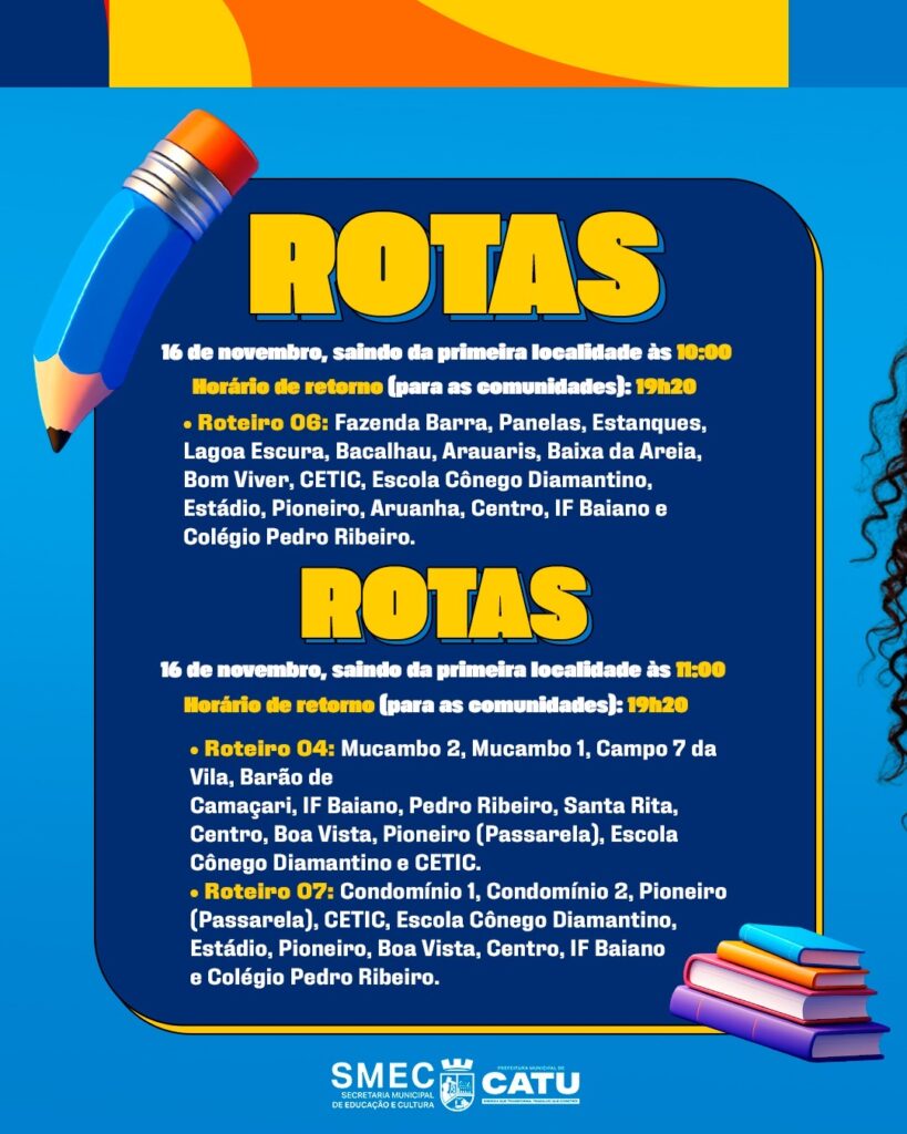 No próximo dia 16 de novembro, a Prefeitura Municipal de Catu, por meio da Secretaria Municipal de Educação e Cultura (SMEC), dará continuidade ao compromisso de apoiar os estudantes que farão o ENEM, disponibilizando transporte gratuito para diversas comunidades da zona urbana e rural.