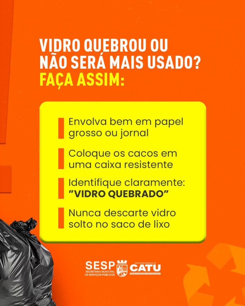A Prefeitura de Catu, por meio da Secretaria Municipal de Serviços Públicos (SESP), reforça um alerta importante à população: o descarte inadequado de vidros pode causar acidentes graves com os garis, profissionais que atuam diariamente na limpeza da cidade.