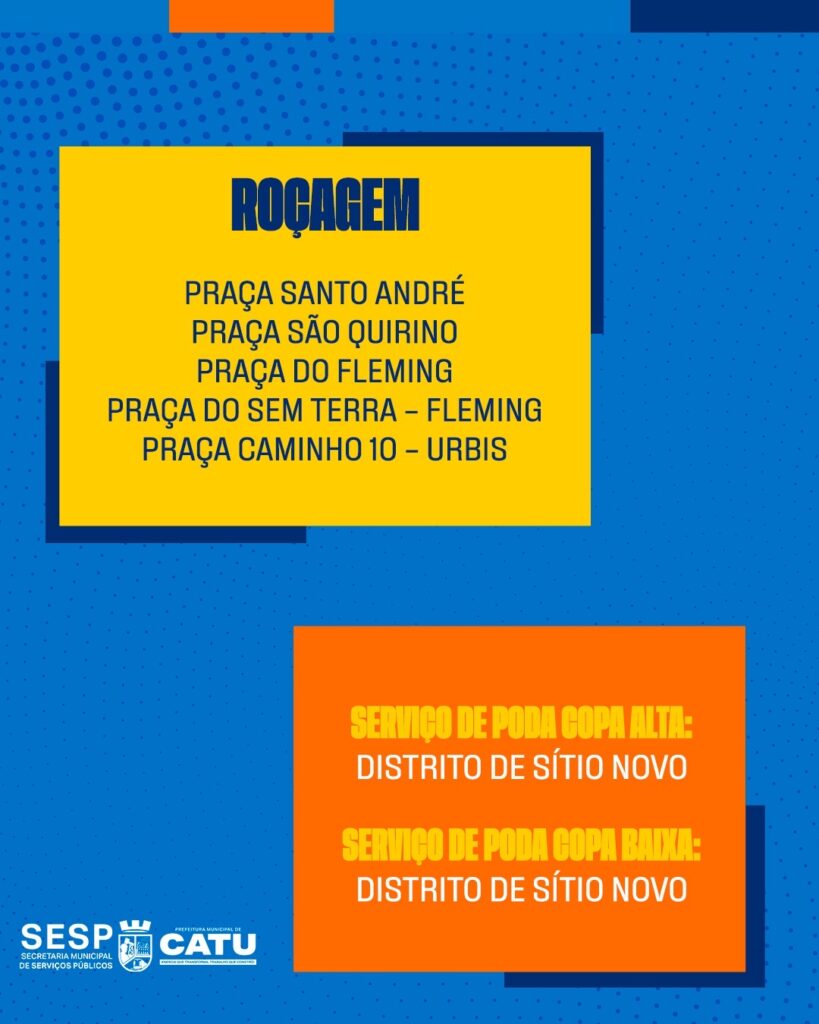 Entre os locais que receberão obras de construção e recuperação de calçadas estão o distrito de Sítio Novo, a região da Garagem da Catuense e a localidade de Aruanha. Já os serviços de jardinagem e roçagem acontecerão em várias praças da cidade, incluindo as praças Santo André, São Quirino, Fleming, Sem Terra e Caminho 10, além do distrito de Sítio Novo.