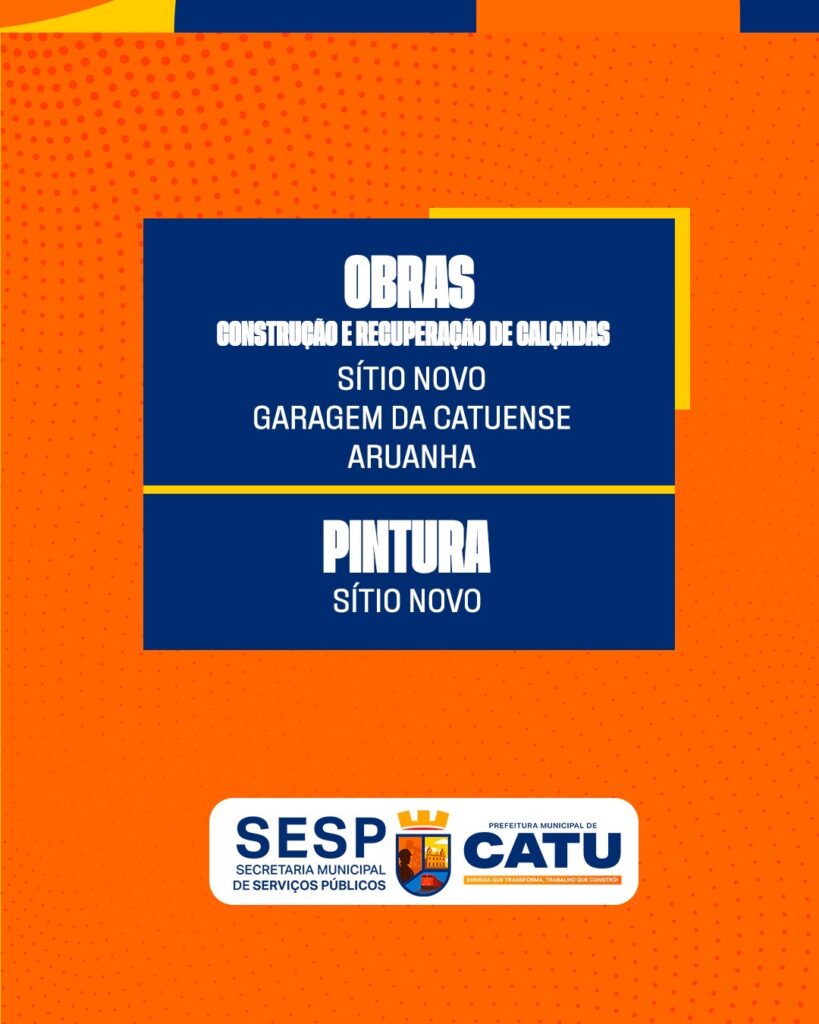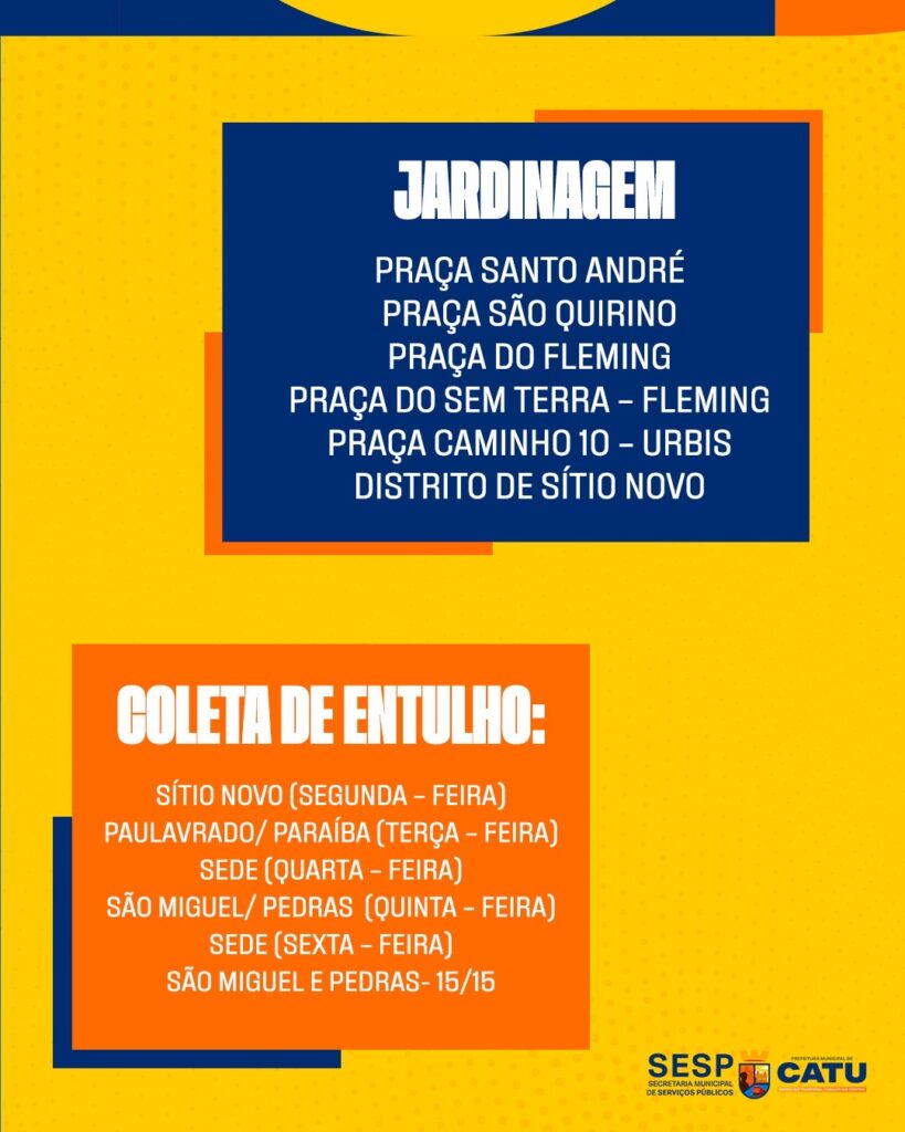 A Prefeitura de Catu, por meio da Secretaria Municipal de Serviços Públicos (SESP), divulgou a programação de atividades que serão realizadas entre os dias 9 e 13 de março em diversos pontos da cidade.