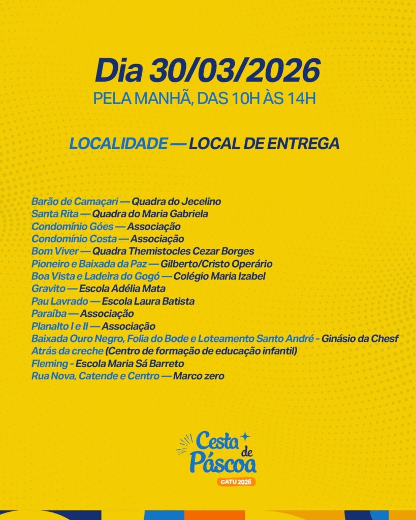 No dia 30 de março, a entrega será realizada na sede, contemplando bairros e comunidades como Barão de Camaçari, Santa Rita, Condomínios Góes e Costa, Bom Viver, Pioneiro, Baixada da Paz, Boa Vista, Gravito, Pau Lavrado, Paraíba, Planalto, entre outros.