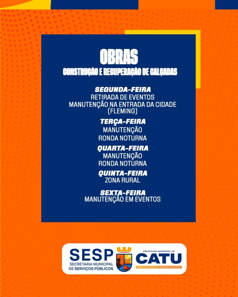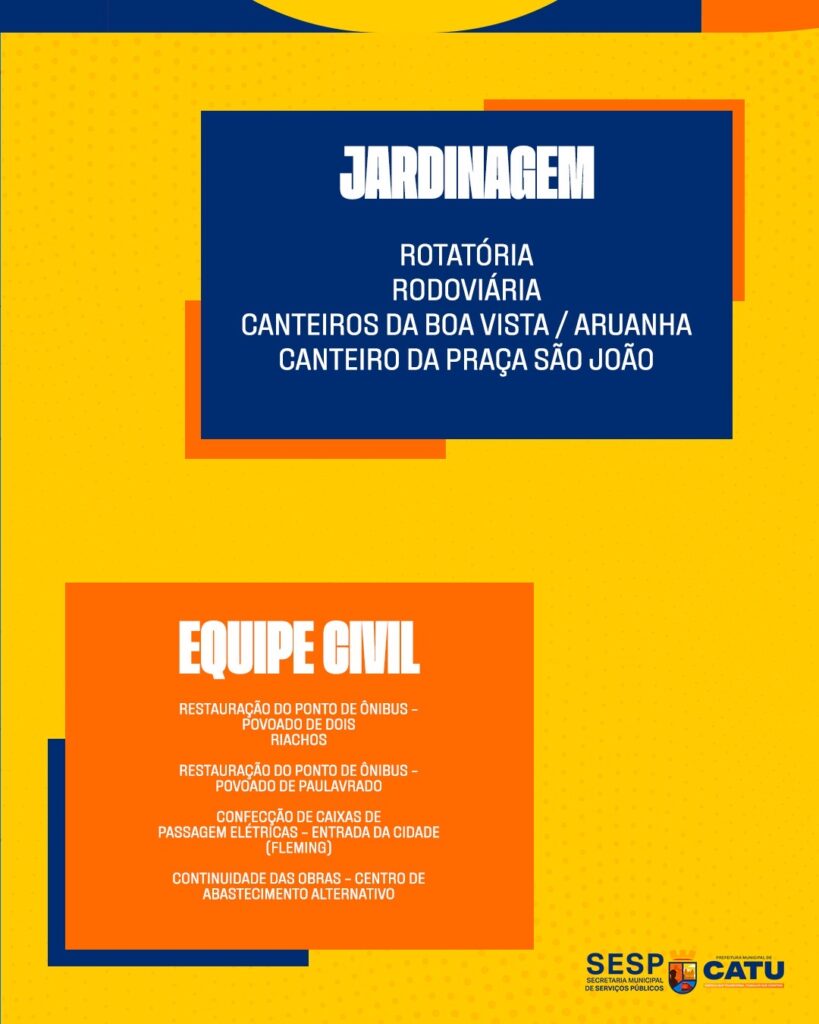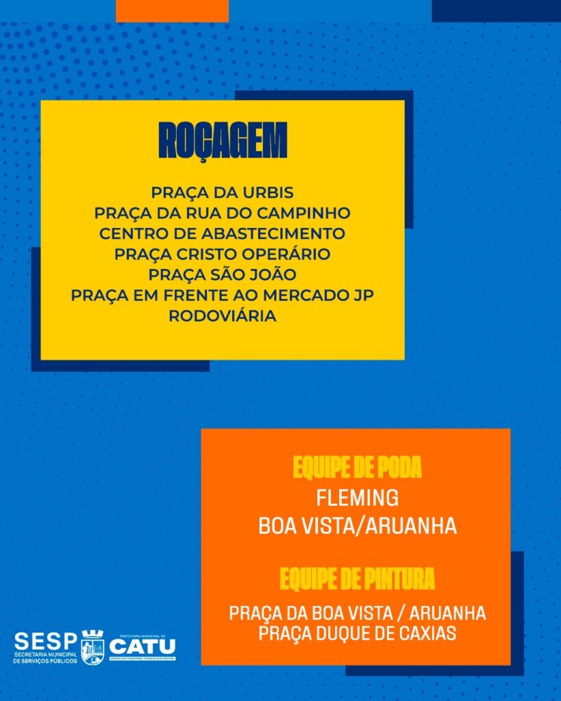 Durante esta semana, as equipes da Secretaria de Serviços Públicos seguem trabalhando em vários pontos de Catu com serviços de roçagem, jardinagem, coleta de entulho, poda de árvores e manutenção urbana.